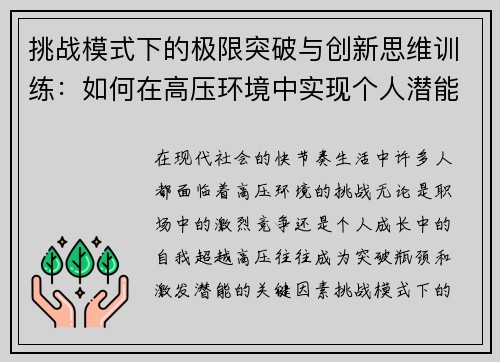 随着移动互联网的发展,安卓手机已经成为现代人生活中不可或缺的一部分,而其中的手机游戏也逐渐成为娱乐和消遣的重要方式。近年来,随着技术的不断创新与玩家需求的多样化,安卓手机游戏呈现出许多新潮玩法,突破了传统游戏模式,带来了极限的体验与创新挑战。本文将从四个方面对安卓手机游戏的新潮玩法进行详细阐述,探讨...